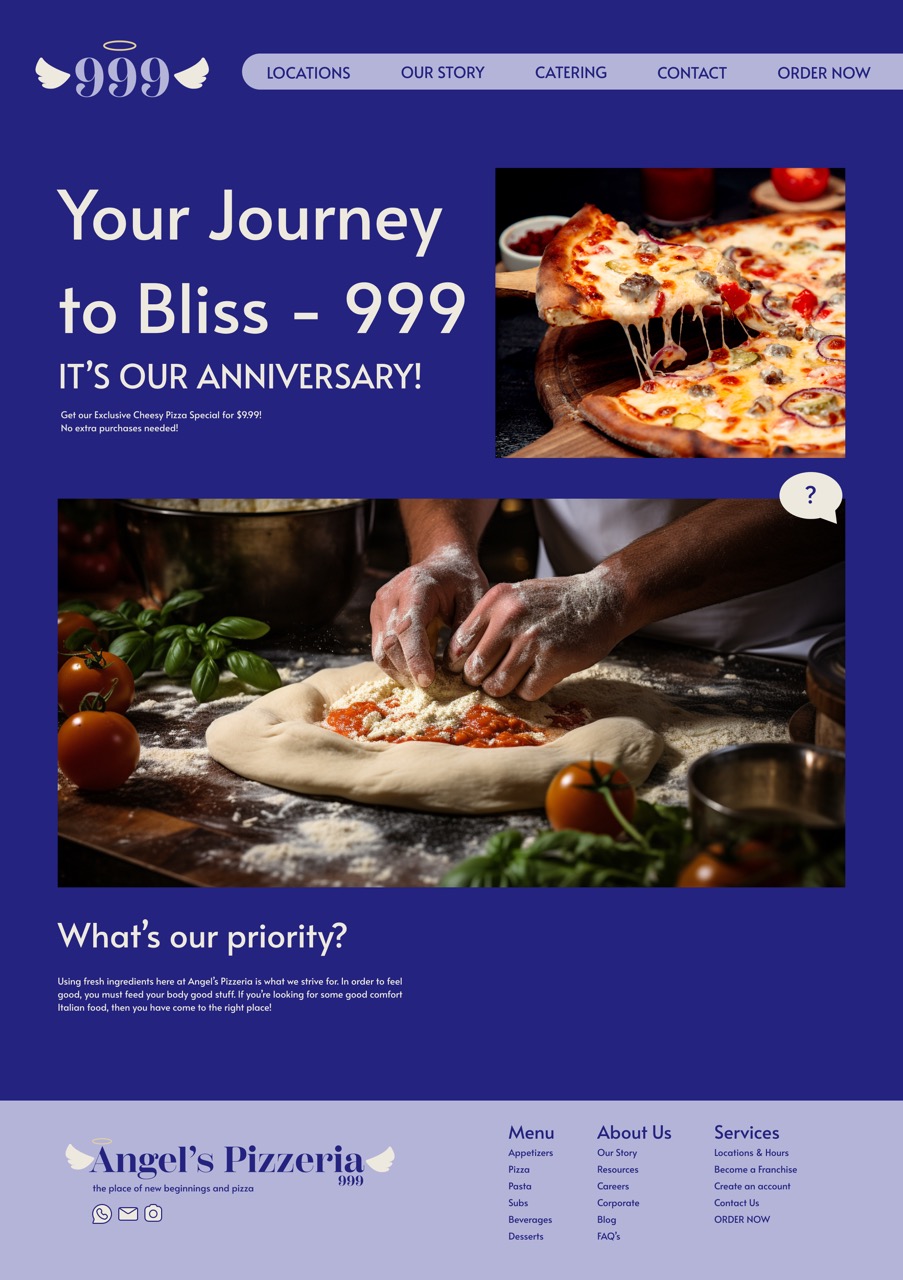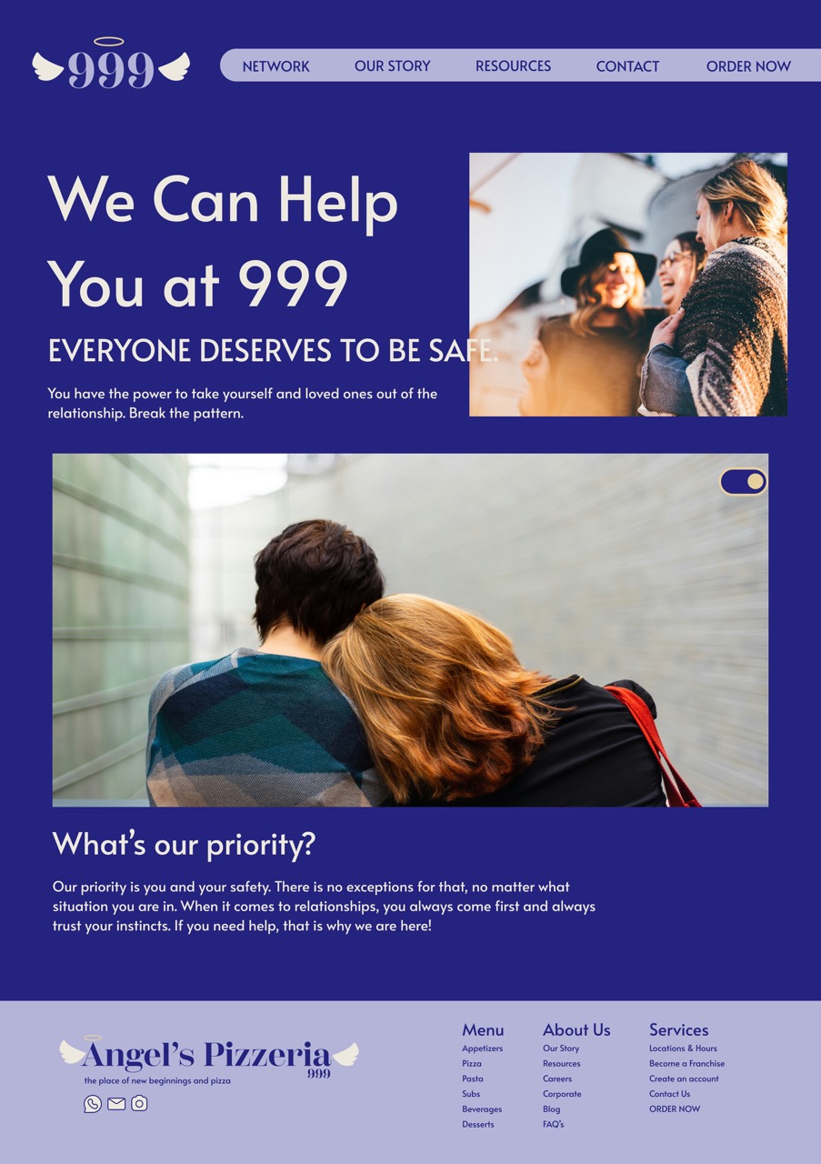 This is Angel's Pizzeria, a dual-designed website focused on informing the user about domestic violence and helping victims get the resources that they need. The user has the ability to switch between the two websites, one being the informative side and safe side.